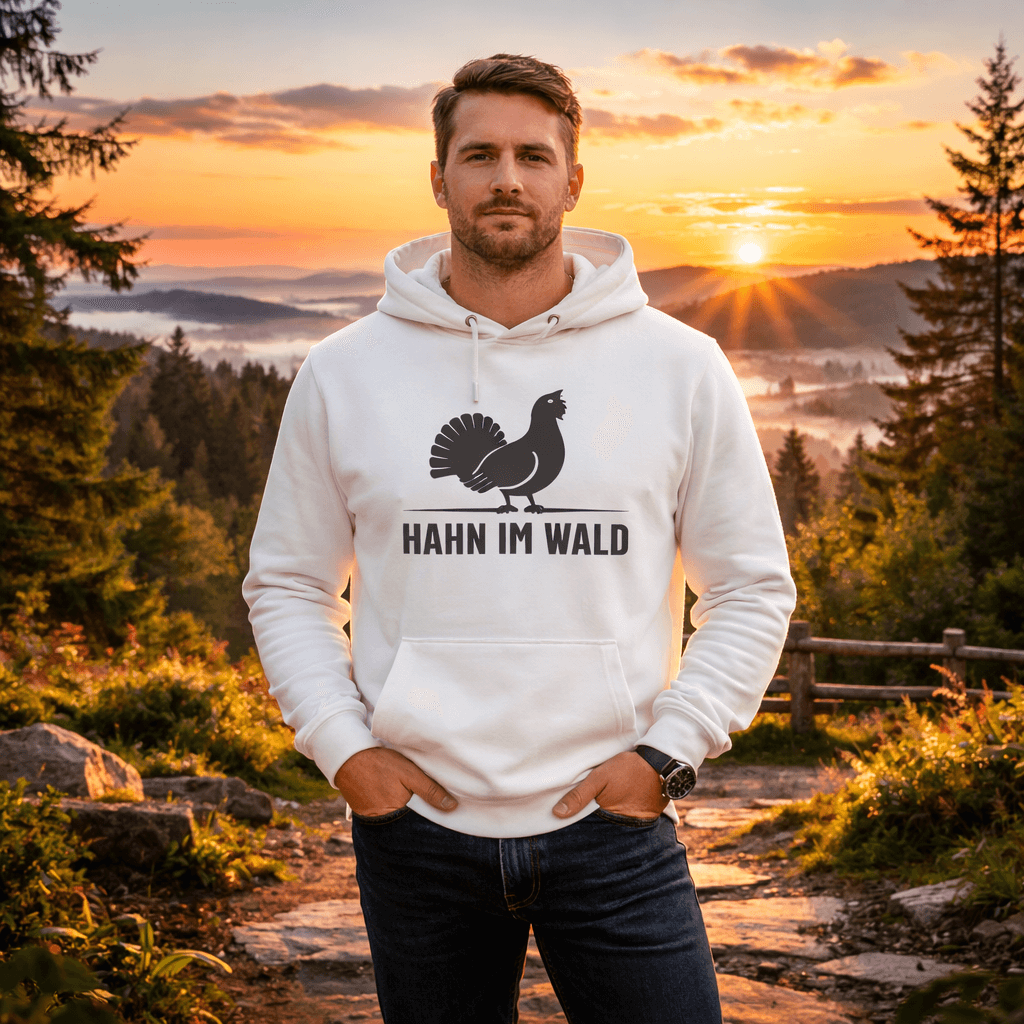 Der Hahn im Wald Hoodie ist gemacht für den Mann von heute, der Haltung zeigt und dabei entspannt bleibt. Das Auerhahn-Motiv zwischen Wald und Tanne bringt Tradition mit einem feinen Augenzwinkern zusammen. Humorvoll, aber nicht verspielt. Klar, aber nicht steif. Genau diese Mischung macht den Hoodie so besonders. Die hochwertige Materialqualität fühlt sich weich auf der Haut an und sorgt mit der angerauten Innenseite für angenehme Wärme. Du bekommst Komfort, der dich durch Alltag, Freizeit und kühle Abende begleitet.